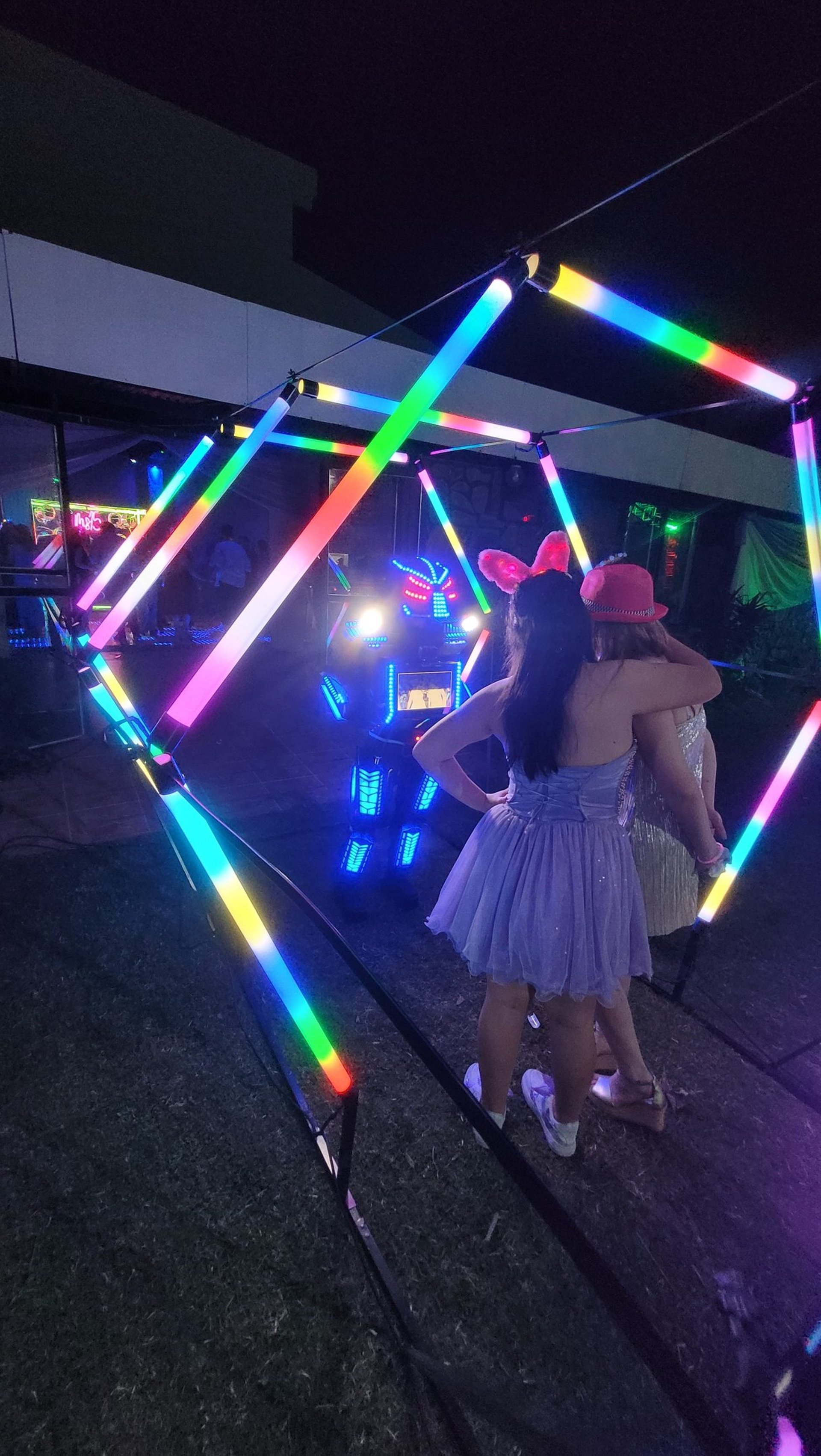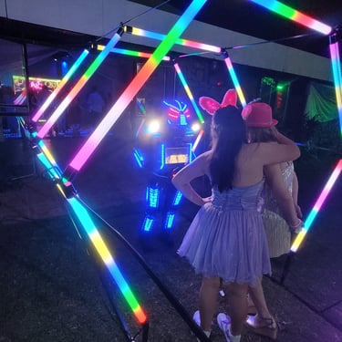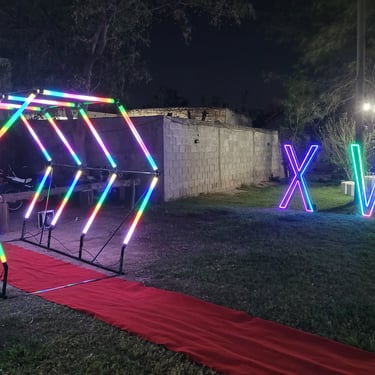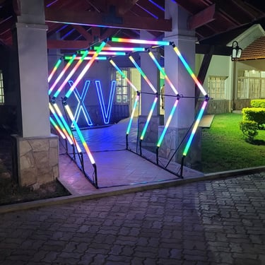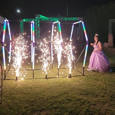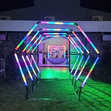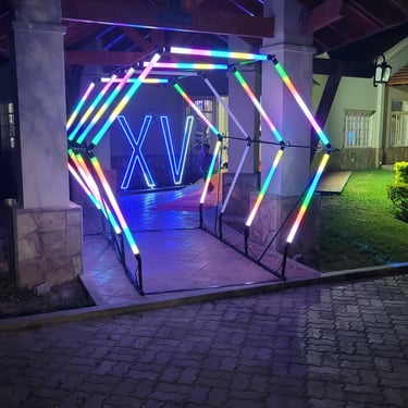 Cuatro arcos pixel led de visión 360 grados y de colores configurables, cubren un recorrido de 3 metros de longitud y 2,2 metros de ancho, además cuenta con un piso Píxel Led, que brinda más elegancia a tu fiesta.